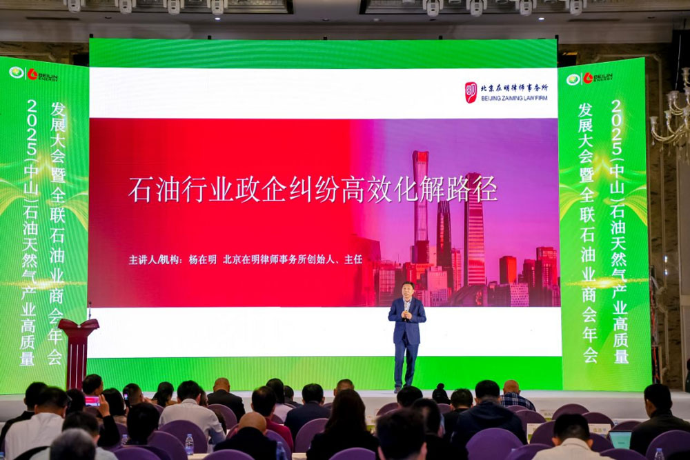 在当前能源结构转型升级、监管强化的经营环境下,经济与政策环境的交织影响,给石油天然气产业带来了更加严峻的挑战。12月20日,一场聚焦行业高质量发展的盛会——2025(中山)石油天然气产业高质量发展大会暨全联石油业商会年会于广东中山成功举行。本次会议以“聚合 赋能 共赢”为主题,汇聚了近两百位业内代表、行业专家及资深从业者,共商经营发展。主任杨在明律师应邀代表出席,并围绕行业普遍关注的“政企纠纷化解”这一核心议题,发表了务实的专业见解。与会期间,北京在明律师事务所(以下简称“在明律所”)与全联石油业商会达成战略合作。